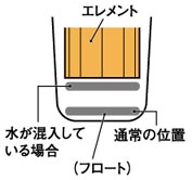 ●目で見て燃料エレメントの汚れがひどい場合は交換。 ※燃料コシ器の中にある、赤いフロートが浮いてしまったら中に水が 溜まっています。取扱説明書等の処置手順により水を排出してください。